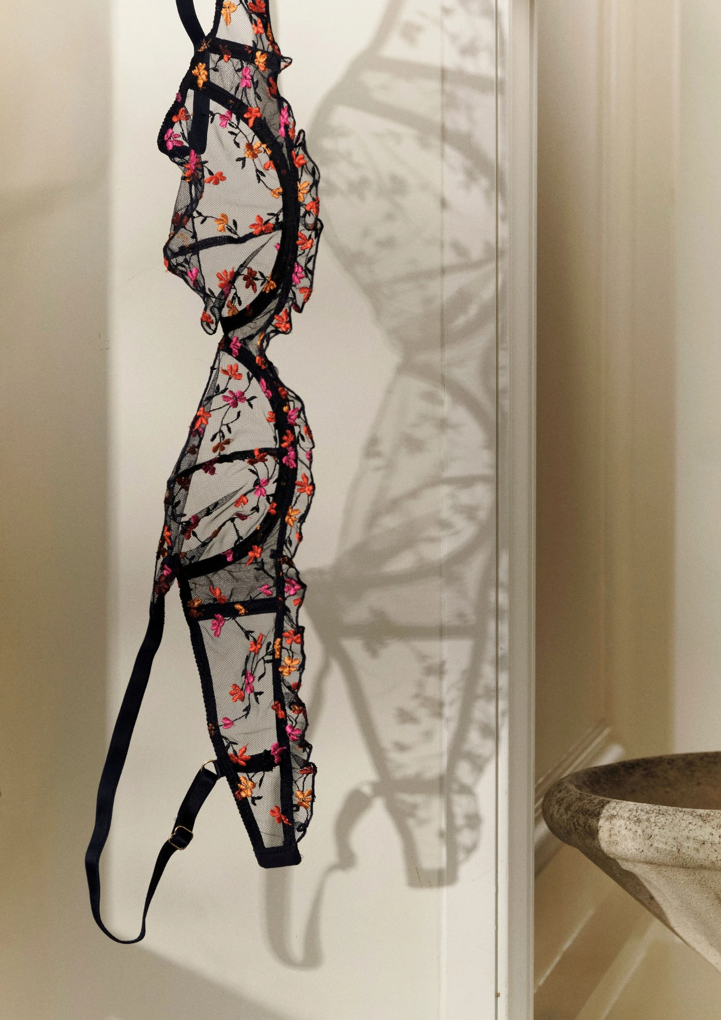 - Broderie avec fleurs colorées sur un tulle bleu marine